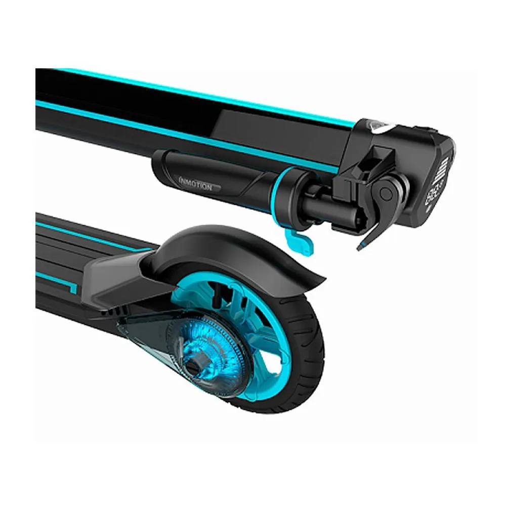 Электросамокат Inmotion L8 – складной, поэтому легко переносить, забирать в поездки, хранить в маленьком помещении. Есть дополнительные колесики внизу корпуса, благодаря которым можно катить самокат сложенным за собой.