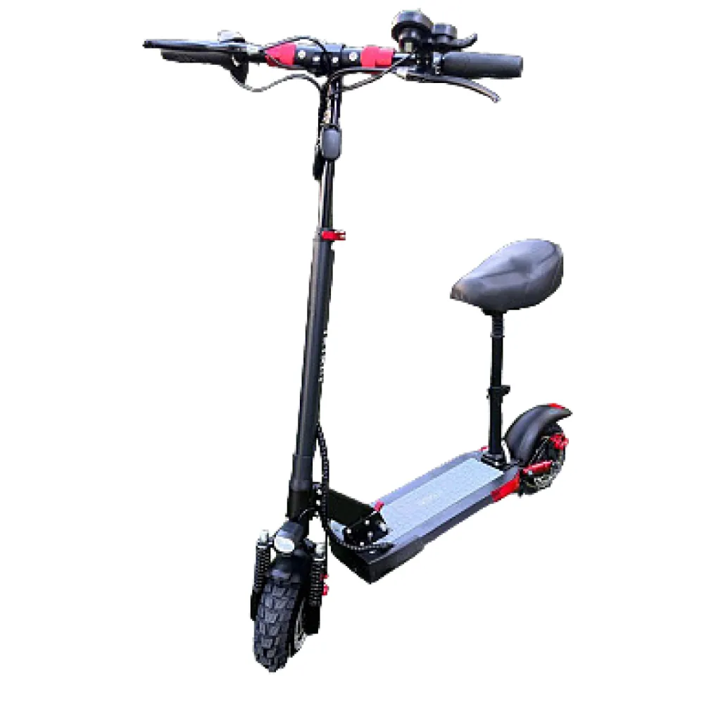 Отличные ходовые характеристики сделали эту модель популярной. Агрегат не боится бездорожья, мощный двигатель 500 Вт и хорошая амортизация делает движение по гравийной и грунтовой дороге достаточно комфортным. Два пружинных амортизатора на переднем и два на заднем колесе делают ход самоката мягким. Для удобного передвижения на большие расстояния предусмотрено съемное сидение. Руль и сидение регулируется по высоте. Колеса с накачиваемыми шинами имеют диаметр 10 дюймов. На переднем и заднем колесах установлена дисковая тормозная система.