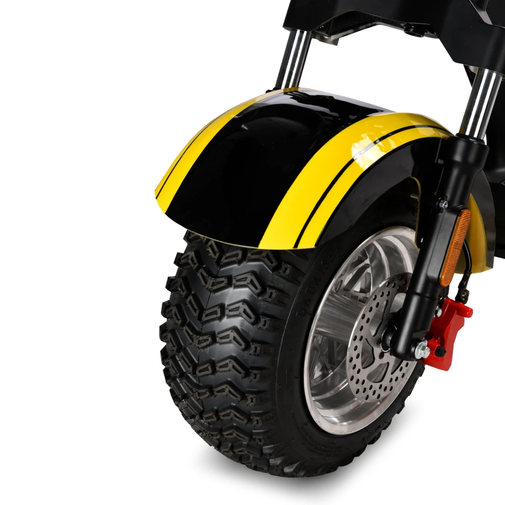 Мощность мотора 2000 Вт (номинал) обеспечивает разгон до 45 км/ч и подъемов до 20–25° даже при полной нагрузке 260 кг, но на неровностях или в дождь скорость падает. Аккумулятор Li-ion 60V дает заявленный пробег 60 км в идеале (Eco-режим, ровный асфальт), балансируют скорость/запас хода, снижая потребление на 20–30% в Eco. Тормоза — гидравлические дисковые (диаметр 120–140 мм), эффективны на мокром асфальте; энергоэффективность высока благодаря рекуперации (5–10% возврата энергии); зарядка (7 часов) стандартна для Li-ion без потери срока службы.